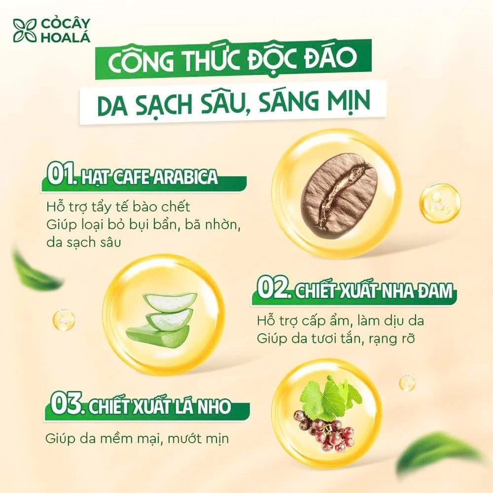 Sữa Tắm Hạt Cafe Cỏ Cây Hoa Lá 300g mang đến giải pháp 2 trong 1: làm sạch + dưỡng sáng, giúp da bạn luôn khỏe khoắn và rạng rỡ.